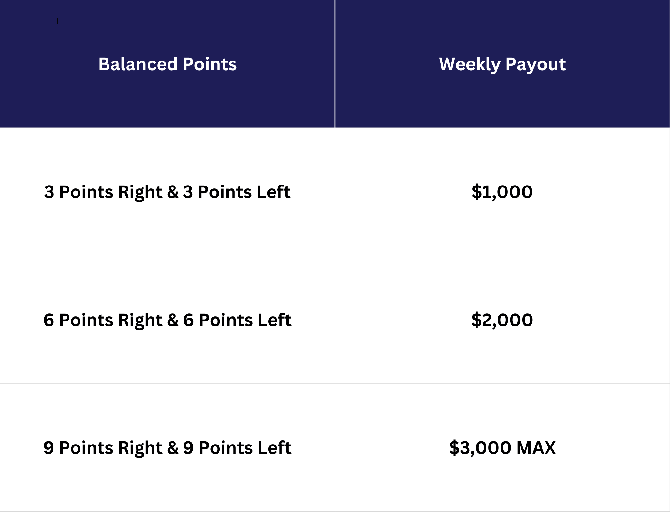 Any points above 9 on either side get washed away, as the maximum is 9. For example, if you had 6 points on your left side and 3 on your right, you would earn a $1,000 commission that week because you matched 3 points on your left and right sides. The remaining 3 unused points on your left side will stay until you match them for another commission. Points reset every week.
